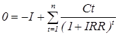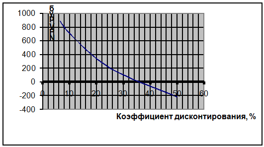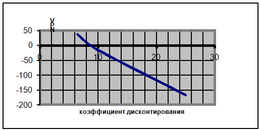 Значение NPV, равное = 36,55 при коэффициенте дисконтирования, равном коэффициенту самоокупаемости, показывает, что внедрение проекта «Фобос» приемлемо при самофинансировании. Значение NPV, равное –166,52 при коэффициенте дисконтирования, равном банковскому кредиту, показывает, что внедрение проекта «Фобос» неприемлемо при банковском кредите. 2.4.3 Расчет IRR инвестиционного проекта «Фобос»Данные для расчета нормы рентабельности инвестиционного проекта приведены в таблице IRR определим графически (см. рисунок 4.1) Таблица 2.4.3. Данные для построения графика расчета IRR