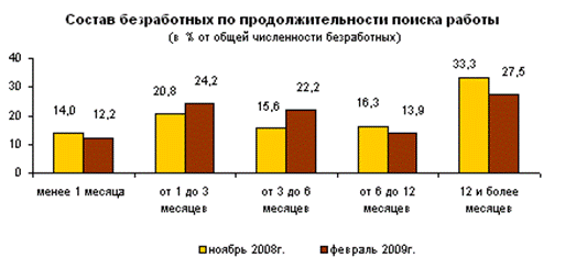 Возрастной состав безработных. Средний возраст безработных в феврале 2009г. составил 35,2 года (в ноябре 2008г. - 34,9 года), в том числе безработных мужчин - 34,8 года, безработных женщин - 35,6 года. Молодежь до 25 лет составляет среди безработных 27,4%, лица в возрасте 50 лет и старше - 16,7%. По сравнению с ноябрем 2008г. в составе безработных увеличилась доля лиц в возрасте 20-24 года (на 0,7 процентного пункта), в возрасте 25-29 лет (на 2,6 процентного пункта), 45-49 лет (на 1,4 процентного пункта). Самый высокий уровень безработицы отмечается в возрастной группе 15-19 лет (32,1%), а также 20-24 года (18,0%). В среднем среди молодежи в возрасте 15-24 года уровень безработицы в феврале 2009г. составил 20%, в том числе среди городского населения - 18,2%, среди сельского населения - 24,4%. Коэффициент превышения уровня безработицы среди молодежи в среднем по возрастной группе 15-24 года по сравнению с уровнем безработицы взрослого населения в возрасте 30-49 лет составляет 2,6 раза, в том числе среди городского населения - 2,7 раза, сельского населения - Продолжительность поиска работы. Около 36,4% безработных - лица, срок пребывания которых в состоянии поиска работы (безработицы) не превышает 3-х месяцев. Один год и более ищут работу 27,5% безработных. По сравнению с ноябрем 2008г. доля краткосрочной безработицы (менее 3 месяцев) увеличилась на 3,4 процентного пункта, доля застойной безработицы (12 месяцев и более) сократилась на 5,8 процентного пункта.