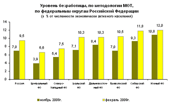 В феврале 2009г. численность экономически активного населения была ниже, чем в ноябре 2008г., на 1,1 млн.человек, или на 1,5%. Это сокращение полностью определяется уменьшением численности занятого населения. Численность безработных, в соответствии с методологией МОТ, в феврале 2009г. была на 1,8 млн.человек, или на треть выше, чем в ноябре 2008г. и феврале 2008 года. Уровень безработицы , исчисленный как отношение численности безработных к численности экономически активного населения, в феврале 2009г. составил 9,5% и был на 2,5-2,4 процентного пункта выше, чем в ноябре 2008г. и феврале 2008 года. Численность безработных и уровень безработицы в феврале 2009г. были в среднем на треть ниже, чем в феврале 1999г., когда было отмечено их максимальное значение.