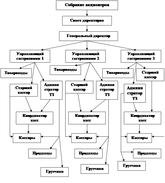 Члены совета директоров (наблюдательного совета) акционерного общества–эмитента: 1) Гайнов Евгений Владимирович (председатель); должность в акционерном обществе-эмитенте не имеет. Гайнов Е. В. Занимает должность коммерческого директора в ОАО «Краслесторг», по адресу 660006,г. Красноярск, ул. Стадионная, 1. 2) Павловская Татьяна Валерьевна; Должность в акционерном обществе-эмитенте: генеральный директор. Должности в других организациях не занимает; 3) Титов Юрий Анатольевич; должность в акционерном обществе-эмитенте не имеет. Титов Ю. А. занимает должность коммерческого директора в ЗАО «Формула», по адресу: 660006, г. Красноярск, ул. Стадионная, 1. Лицо, осуществляющее функции единоличного исполнительного органа акционерного общества-эмитента: Павловская Т. В. Цели сети гастрономов «Красный Яр» ОАО «Енисейская торговая компания»: ¾ предоставление услуг по розничной торговле; ¾ получение; ¾ завоевание большей доли рынка. Совет директоров общества осуществляет общее руководство деятельностью общества, за исключением решения вопросов, отнесенных настоящим Федеральным законом к компетенции общего собрания акционеров. В обществе с числом акционеров - владельцев голосующих акций менее пятидесяти устав общества может предусматривать, что функции совета директоров общества осуществляет общее собрание акционеров. В этом случае устав общества должен содержать указание об определенном лице или органе общества, к компетенции которого относится решение вопроса о проведении общего собрания акционеров и об утверждении его повестки дня. По решению общего собрания акционеров членам совета директоров общества в период исполнения ими своих обязанностей могут выплачиваться вознаграждение и компенсироваться расходы, связанные с исполнением ими функций членов совета директоров общества. Размеры таких вознаграждений и компенсаций устанавливаются решением общего собрания акционеров. Рис. 1 - Организационная структура сети гастрономов «Красный Яр»
