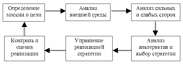 Рис. 2.1. Процесс управления организацией Процесс состоит из шести последовательно выполняемых этапов. Определение миссии и цели является первым и самым ответственным решением в стратегическом управлении, поскольку цели служат ориентирами для всех последующих этапов, и одновременно накладывают определенные ограничения на направления деятельности организации при выборе стратегии. Миссия – философия организации, смысл ее существования. Цель – конкретизация миссии, идеальный образ желаемого состояния. Через определение миссии и целей организация стремится представить свое будущее, направления развития своего бизнеса. Анализ внешней среды представляет собой оценку состояния и перспектив развития важнейших, с точки зрения организации, субъектов и факторов окружающей среды: отрасли рынков, поставщиков и совокупности глобальных факторов внешней среды, на которые организация не может оказывать непосредственное влияние. Внешняя среда неоднородна и дифференцирована по силе, периодичности, характеру влияния на организацию. В ней можно выделить среду косвенного воздействия (макроокружение) и среду непосредственного окружения. Задачи анализа внешней среды состоят в установлении и оценке влияющих факторов, представляющих угрозу или способствующих развитию организации; в изучении изменений, влияющих на текущую деятельность организации, и установлении их тенденций. Макроокружение создает общие условия, в которых действует предприятие, определяя для него и других предприятий границы допустимого и недопустимого. Подобно тому, как атмосфера по разному действует на человека, так и макроокружение в разной степени влияет на организацию в зависимости от уровня ее «здоровья». При анализе экономических факторов рассматривают темпы инфляции (дефляции), налоговую ставку, международный платежный баланс, уровень занятости населения в целом и в отрасли, платежеспособность предприятий. При анализе политических факторов следует следить за соглашениями по тарифам и торговле между странами, протекционистской таможенной политикой, направленной против третьих стран, нормативными актами местных органов власти и центрального правительства, уровнем развития правового регулирования экономики, отношением государства к антимонопольному законодательству, кредитной политикой местных властей. Рыночные факторы включают многочисленные характеристики, оказывающие непосредственное влияние на эффективность работы организации. Их анализ позволяет руководству фирмы уточнить ее стратегию и укрепить свои позиции на рынке. Здесь исследуют изменение демографических условий, уровень доходов населения, долю рынка, жизненные циклы товаров, уровень конкуренции в отрасли и т.д. Руководство организации обязано постоянно следить за технологической внешней средой, чтобы не упустить момент появления в ней изменений. Анализ технологической внешней среды должен учитывать изменения в технологии производства, создание новых технологий, применение ЭВМ для проектирования новых товаров, чтобы организация могла быть конкурентоспособной. Анализ факторов конкуренции предполагает постоянный контроль со стороны руководства организации за действиями конкурентов. В анализе конкурентов выделяют четыре диагностические зоны: анализ будущих целей 