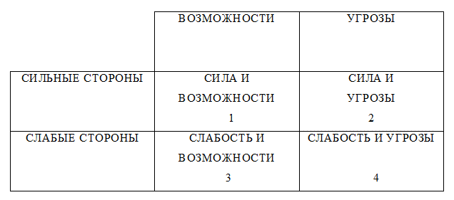 Итогом анализа внешней и внутренней среды является выявлением угроз и возможностей, сильных и слабых сторон организации, с помощью которых представляется возможным выявить и ранжировать проблемы, стоящие перед организаций. Под сильными сторонами организации понимают все, что обеспечивает ей преимущества над конкурентами: высокая компетентность, достаточные финансовые ресурсы, совершенная технология, хороший менеджмент, высокая трудовая этика, квалифицированная команда управленцев, хорошая система контроля качества продукции и процессов и др. Слабые стороны организации – это то, что не позволяет ей достичь преимущества над конкурентами: устаревшее оборудование, высокие производственные издержки, отсутствие четких стратегий развития, нехватка финансовых или иных ресурсов, устаревшая организационная структура, слабое представление о рынке и др. Разработка стратегии должна опираться на сильные стороны предприятия и быть такой, чтобы минимизировать воздействие слабых сторон. Для этого выясняют как изменения ситуации на рынке, и в какой мере соотносятся с сильными и слабыми сторонами организации. Проследить возможное сочетание характеристик рыночной ситуации с сильными и слабыми сторонами предприятия можно с помощью СВОТ-анализа и метод экспертных оценок. Технология проведения СВОТ-анализа предусматривает составление матрицы, вид которой приведен на рис. 2.2. Первое поле - стратегии, использующие сильные стороны для реализации возможностей. Второе поле – стратегии, использующие сильные стороны для устранения угроз. Третье поле – стратегии, минимизирующие слабости организации, используя возможности ситуации. Четвертое поле – стратегии, минимизирующие слабости и угрозы, появившиеся во внешней среде.