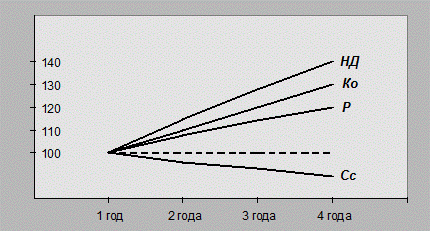 Быстрее всего растет объем национального дохода НД , несколько медленнее увеличивается объем затрат основного капитала Ко и численность рабочей силы Р . В итоге снижается себестоимость единицы продукции Сс , расширенное же воспроизводство приобретает качественно новые черты.