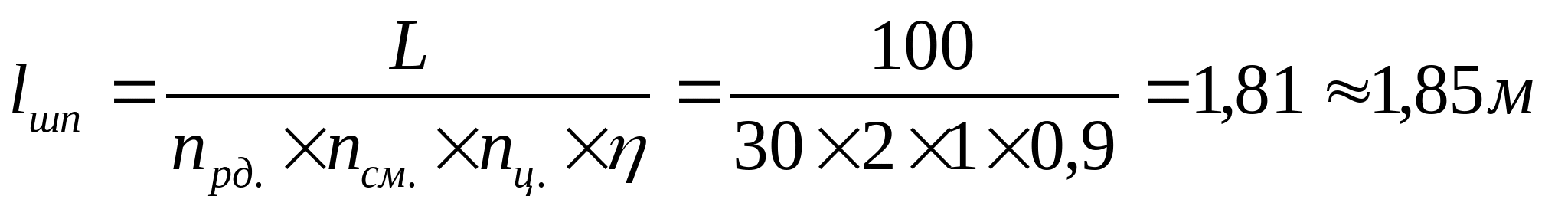 ГОСТ 22940-85 Размеры выработки в свету: l1 l2- 2580mm. h-2720mm. Sсв.= 6,1м2. h l 2 Размеры выработки в проходке: l1 l2- 2980mm. h-2920mm. Sпр. = 7,7м2. h l2 2 Определение глубины шпуров. Глубина шпуров зависит от трудоёмкости и длительности всех процессов в проходческом цикле Выбираем режим работы: количество рабочих дней nрд. = 30; число рабочих смен в сутки nсм.= 2; nц. = 1; КИШ η = 0,9; L = 100(месячный план проходки выработки). Глубина шпуров в комплекте: