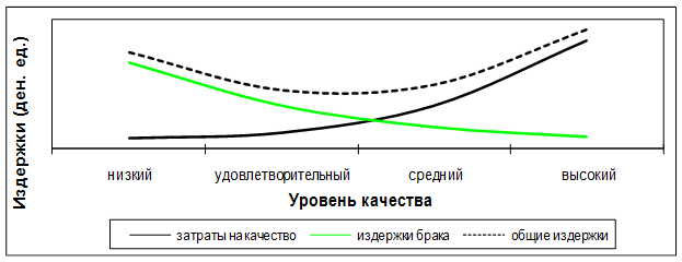 Из табл. 3.1 можно сделать вывод, что основной причиной брака помимо боя явилась поставка некачественного сырья или иных видов материальных ресурсов. В отчетном году, основываясь на опыте предыдущего периода, производитель составил договор на поставку материалов, предусматривающий компенсацию в случае их низкого качества, которая и позволила сократить абсолютный размер потерь от брака на (82 000– 92 700) = - 10 700 ден. ед. (3.1) или на 113% ( Относительный размер потерь от брака снизился на 7,6 – 5,3 = 2,3%. Определим стоимость годной продукции, которая могла бы быть получена при отсутствии брака (Dq). Для этого следует фактический объем товарной продукции в плановых ценах (q1 Pпл ) умножить на долю окончательного брака производственной себестоимости (dо.б. ). Или: Dq = q1 Pпл * dо.б. . (3.3) Пусть для нашего примера q1 Pпл = 1 600 000 ден. ед. Тогда: Dq = 1 600 000 * Менеджеры должны рекомендовать руководству фирмы найти предприятие, поставляющее более качественное сырье для данного производства. И анализ брака, обнаруженного на предприятии, и анализ реклмаций следует проводить по их причинам: - производственно-технологическим; - конструктивных недостатков; - качества сырья и комплектующих изделий; - по вине рабочих; - прочим. Это позволит более точно определить размер излишне израсходованных средств и пути снижения затрат на обеспечение качества продукции. Затраты, связанные с решением проблем по возникновению, предотвращению брака, иногда могут превышать затраты, которое несет предприятие, если брак не устранен. Для этого следует тщательно проанализировать затраты на предотвращение различных дефектов и их устранение. Конечно же, при увеличении издержек на управление качеством издержки брака будут уменьшаться. Однако это не значит, что предприятию стоит неограниченно увеличивать затраты на качество. Необходимо постоянно анализировать издержки на управление качеством, издержки брака и общие издержки предприятия, т.к. при необоснованном увеличении затрат на качество возможен рост общих издержек.