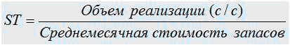 В числители – стоимость выполненных заказов за период, как правило, за месяц, а в знаменателе - стоимостное значение спроса за тот же период времени. Значение SL должно стремиться к 100%, достигая достаточного максимально достаточного уровня 96-97%. При замерах SL у большинства белорусских и российских компаний на стадии начала проекта мы фиксируем значения в среднем близкие к 60%, что свидетельствует о том, что предприятия потенциально недополучает порядка 40% оборота. Подавляющее большинство теоретиков воспринимают логистику как совокупность инструментов, позволяющих прежде всего снизить затраты предприятия и на этом делают большую ошибку! Второй показатель, требующий обязательного замера – это Stock Turnover (ST) (оборачиваемость товарных запасов), Stock Turnover (ST) рассчитывается по формуле: