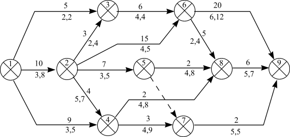 Рис. 1.3. Сетевой график варианта 8. 2. Постановка задачиПроизвести увязку трех локальных сетевых графиков возведения объектов с учетом ограничений по трудовым ресурсам. Рассчитать локальные сетевые графики по отдельности. Рассчитать трудоемкость каждого объекта и общую сумму для максимального числа работников. Произвести ранжирование объектов и присвоить объектам номер Увязать графики в единую сетевую модель совместного возведения трех объектов при условии постоянной загрузки трудовых ресурсов. 1) на объектах работает 4 бригады по 9 человек; 2) максимально стремиться к сохранению исходных сетевых графиков 3) две бригады (звена) не могут выполнять одну и ту же работу. Для этого необходимо разделить объемы работ (трудозатраты) для каждой бригады отдельно; 4) каждую бригаду обозначить своим цветом или линией; 5) допускается уровень недогрузки трудовых ресурсов в конце выполнения всего комплекса работ на 3 объектах в размере 5% от общей продолжительности. При этом на сетевом графике необходимо показать уход конкретного количества трудовых ресурсов и номер бригады. Сделать ведомость объектов и таблицу перекодировки номеров работ. По результатам расчетов провести анализ совмещения локальных графиков. 3. Расчет локальных сетевых графиков3.1. Принципы расчета сетевых графиков3.1.1. Расчет параметров событий сетевого графикаРанний срок свершения исходного нулевого события сетевого графика (СГ) принимается равным нулю. Ранний срок свершения данного промежуточного события рассчитывается путем сравнения сумм, состоящих из раннего срока свершения события, непосредственно предшествующего данному и длительности работы. В качестве раннего срока свершения события принимается максимальная из сравниваемых сумм. Поздний срок свершения данного промежуточного события определяется при просмотре СГ в обратном направлении. Для этого сопоставляются разности между поздним сроком свершения события, непосредственно следующего за данным. Поздний срок свершения равен минимуму из подсчитанных разностей. Резерв времени образуется у тех событий, для которых поздний срок свершения больше раннего, и он равен их разности. Если же эти сроки равны, событие резервом времени не располагает и, следовательно, лежит на критическом пути. 3.1.2. Расчет параметров работ сетевого графикаРанний срок начала работы совпадает с ранним сроком свершения ее начального события. Поздний срок начала работы можно получить, если из позднего срока свершения ее конечного события вычесть ее ожидаемую продолжительность. Ранний срок окончания работы образуется прибавлением ее продолжительности к раннему сроку свершения ее начального события. Поздний срок окончания работы совпадает с поздним сроком свершения ее конечного события. Полный резерв времени работы образуется вычитанием из позднего срока свершения ее конечного события раннего срока свершения ее начального события и ее ожидаемой продолжительности. Частный резерв времени первого рода равен разности поздних сроков свершения ее конечного и начального событий за вычетом ее ожидаемой продолжительности. Частный резерв времени второго рода равен разности ранних сроков свершения ее конечного и начального событий за вычетом ее ожидаемой продолжительности. Свободный резерв времени работы образуется вычитани