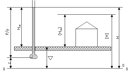 Рис. 5.1 Схема установки насоса S =18,66/12,5= 1,49 дм2 Соответственно диаметр трубопровода d= 1,49 дм = 149 мм. Погружной насос опускается в скважину на нагнетательном трубопроводе, поэтому принимаем стандартные стальные трубы ГОСТ 10704-86 имеющие наружный диаметр 152 мм, толщину стенок 3,5 мм (таблица 9.8 [1]). Тогда внутренний диаметр трубопровода: d= 152-7 = 145 мм = 1,45 дм, площадь поперечного сечения S= 1,65 дм2. Определяем скорость воды в стандартном трубопроводе: ν= Qр/S = 18,66/1,65 =11,31 дм/с = 1,13 м/с; Данная скорость соответствует рекомендуемому СНиП диапазонов скоростей(0,8…2) м/с, поэтому трубопровод выбран правильно. Определяем потери напора в трубопроводе. Предварительно находим коэффициент гидравлического трения: