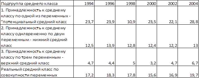 Численность российского среднего класса оценивается в пределах 16-20%, и в целом он являлся достаточно устойчивым фрагментом социально-экономической структуры населения.[22] Информационной базой исследования являются материалы Российского мониторинга экономического положения и здоровья населения (РМЭЗ). Исследование опирается на данные шести волн мониторинга (с пятой по тринадцатую - за 1994,1996,1998,2000,2002 и 2004 гг.), в течение которых ежегодно опрашивалось около 11 тыс. чел. в 4 тыс. домохозяйств. РМЭЗ дает разнообразную информацию о доходах домохозяйств, обеспечивает данные о составе семей, социально-профессиональных и демографических характеристиках членов домохозяйств. Единицей наблюдения в расчетах выступал индивид - член домохозяйства. Индикатором уровня образования, соответствующего статусу среднего класса, рассматривался третичный уровень образования (специальное среднее профессиональное образование, профессиональное вузовское образование и послевузовское образование - аспирантура, докторантура) по Международной стандартной классификации образования. Численность группы населения, имеющего дипломы об окончании профессиональных средних специальных и высших учебных заведений, составляла в совокупности в 1994-2004 гг. примерно 28%.[23] Стратификационная шкала населения по профессионально-должностному статусу, учитывающая характер работы человека и связанную с ним степень влияния и ответственности, построена на основе кодификатора профессий базы данных РМЭЗ. Кодификатор содержит около 400 названий отдельных профессий и групп профессий. Среди них насчитывается более 30 профессиональных групп работников, выполняющих функции управляющих и руководителей (законодатели, чиновники, корпоративные и генеральные управляющие). Кодификатор содержит также более 40 групп профессий специалистов с высшим образованием и около 70 - технических специалистов со специальным образованием. Вместе с профессиональными группами работников, выполняющих функции управляющих и руководителей, они и представляют профессиональный средний класс. Он насчитывает 15-16% выборочной совокупности населения. Стратификационная шкала уровня доходов. В условиях высокого уровня неравенства в распределении доходов в нашей стране и их смещения в сторону бедности невозможно воспользоваться простым способом определения границ среднего доходного слоя. В России эти границы определяются по-разному. Для выделения средних экономических слоев в данном исследовании использовалась величина дохода на потребительскую единицу в семье, нормированная на величину регионального прожиточного минимума. На основе этой величины можно выделить основные социально-экономические группы населения. Средний нижний слой на этой шкале включает население с доходами от 2,74 до 5,49 прожиточного минимума. Средний верхний слой охватывает население, располагающее денежными доходами от 5,5 до 8,24 прожиточного минимума. Численность доходных средних слоев в отличие от слоев, выделенных по уровню образования и по профессионально-должностному статусу, была наименее стабильной. Своего минимума - 13,9% состава населения по сравнению с 18,4% в 1994 г. она достигла в 2000 г. Но затем удельный вес средних слоев снова стал увеличиваться и в 2004 г. уже составлял 28% от численности населения. А в среднем величи