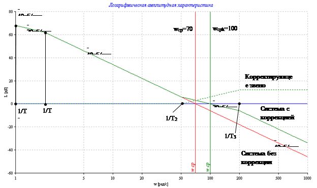 где, T2 =0,02сек T3=0,005сек Построим логарифмические амплитудно-частотные характеристики скорректированной системы с передаточной функцией