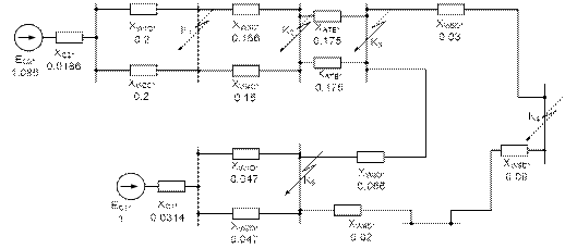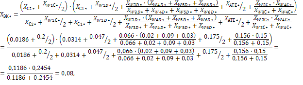 7.4 Расчёт минимального тока трёхфазного короткого замыканияМинимальный ток к.з. для точек Схема замещения для расчёта минимального тока к.з. представлена на рисунке 7.3.1 с учётом вывода из схемы соответствующих линий. Расчёт выполняем аналогично предыдущему пункту. Расчёт сведён в таблицу 6. Таблица 6 Расчёт минимального тока к.з.