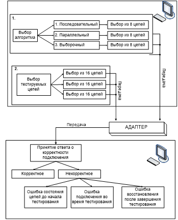 Рисунок 3.1 – Последовательность действий пользователя ПЭВМ Размер поля «Выбор цепей подключения питания» определяется количеством цепей, на которые необходимо подавать питание (в нашем случае, количество цепей подачи питания – 8, поэтому выбирается 1 байт, каждый бит которого соответствует срабатыванию одного из восьми реле. Состояние логической «1» – подача питания на соответствующий ключ, состояние логического «0» – ключ остаётся в исходном состоянии). Размер поля «Выбор цепей тестирования» определяется количеством проверяемых цепей (в нашем случае, количество цепей – 16, поэтому выбирается 2 байта, каждый бит которых соответствует состоянию одной из цепей. Состояние логической «1» – осуществляется проверка, состояние логического «0» – не проверяется.