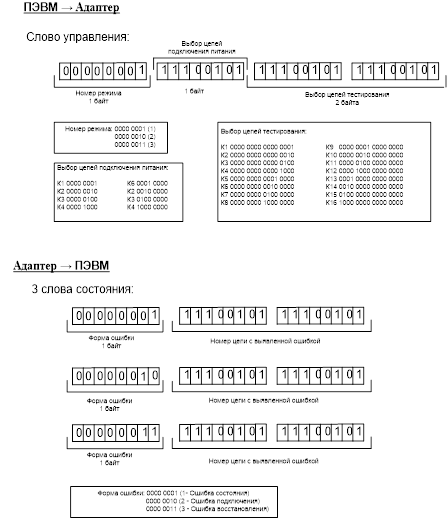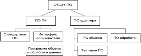 Рисунок 3.2 – Кодограмма обмена ПЭВМ и адаптера 3.3.3 Сформированная посылка размером 4 байта и содержащая параметры проверки состояния цепей передаётся в адаптер, который осуществляет подключение и проверку цепей в соответствии с заданным режимом и отправляет ответ о корректности работы проверяемого устройства в виде трёх слов состояния. Каждое слово содержит информацию об ошибках в тестируемых цепях. Размер слова 3 байта. Первый байт отвечает за вид (форму ошибки). Возможно три варианта: ошибка состояния цепей до начала тестирования, ошибка подключения во время тестирования, ошибка восстановления после окончания тестирования. В каждом слове фиксированное значение режима. Первое слово значение первого байта 0000 0001 – ошибка состояния цепей до начала тестирования. Второе слово значение первого байта 0000 0010 – ошибка подключения во время тестирования. Третье слово значение первого байта 0000 0011 – ошибка восстановления после окончания тестирования. В каждом слове фиксированное значение режима. Второй и третий байт отвечают за номер цепи, в которых обнаружена ошибка. Один бит соответствует одной из 16 цепей. В результате ответа адаптера в ПЭВМ должно придти три слова, в которых указано номер и вид ошибки. Заданные параметры и результаты тестирования анализируются и отображаются на мониторе ПЭВМ. 3.4 Общее программное обеспечение 3.4.1 В устройствах управления физической установкой (контроллерах) на основе микро-ЭВМ аппаратурные средства и программное обеспечение существуют в форме неделимого аппаратно-программного комплекса. При проектировании контроллеров приходится решать одну из самых сложных задач разработки, а именно задачу оптимального распределения функций контроллера между аппаратурными средствами и программным обеспечением. Решение этой задачи осложняется тем, что взаимосвязь и взаимовлияние аппаратных средств и программного обеспечения в микропроцессорной технике претерпевают динамичные изменения. Если в начале развития МП-техники определяющим было правило, в соответствии с которым аппаратные средства обеспечивают производительность, а программное обеспечение – дешевизну изделия, то в настоящее время это правило нуждается в серьезной корректировке. Так как МК представляет собой стандартный массовый (относительно недорогой) логический блок, конкретное назначение которого определяет пользователь с помощью программного обеспечения, то с ростом степени интеграции и, следовательно, функционально-логических возможностей МК резко понижается стоимость изделия в пересчете на выполняемую функцию, что в конечном итоге и обеспечивает достижение высоких технико-экономических показателей изделий на МК. При этом затраты на разработку программного обеспечения изделия в 2 – 10 раз превышают (за время жизни изделия) затраты на приобретение и изготовление аппаратных средств. Структурная схема программного обеспечения ПАК приведена на рисунке 3.3. Общее программное обеспечение ПАК состоит из программного обеспечения ПК и программного обеспечения адаптера. Более подробное описание этих блоков приводится ниже. 3.4.2 Программное обеспечение адаптера. Программное обеспечение (ПО) адаптера включает в себя: – ПО обмена данными; – ПО обработки информации; – тестовое ПО. ПО обмена данными выполняет следующие функции: 