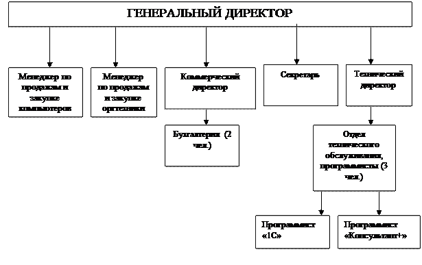 Рис. 3. Существующая организационная структура управления ООО «Татьяна». Линейная организационная структура управления – это одна из простейших организационных структур управления. Она характеризуется тем, что во главе каждого структурного подразделения находится руководитель-единоначальник, наделенный всеми полномочиями и осуществляющий единоличное руководство подчиненными ему работниками и сосредоточивающий в своих руках все функции управления. При линейном управлении каждое звено и каждый подчиненный имеют одного руководителя, через которого по одному единовременному каналу проходят все команды управления. В этом случае управленческие звенья несут ответственность за результаты всей деятельности управляемых объектов. Речь идет о пообъектном выделении руководителей, каждый из которых выполняет все виды работ, разрабатывает и принимает решения, связанные с управлением данным объектом. Поскольку в линейной структуре управления решения передаются по цепочке “сверху вниз”, а сам руководитель нижнего звена управления подчинен руководителю более высокого над ним уровня, формируется своего рода иерархия руководителей данной конкретной организации. В данном случае действует принцип единоначалия, суть которого состоит в том, что подчиненные выполняют распоряжения только одного руководителя. Вышестоящий орган управления не имеет права отдавать распоряжения каким-либо исполнителям, минуя их непосредственного начальника. В линейной структуре управления каждый подчиненный имеет начальника, а каждый начальник имеет несколько подчиненных. Такая структура функционирует в небольших организациях. В линейной структуре система управления организацией компонуется по производственному признаку с учетом степени концентрации производства, технологических особенностей, ассортимента выпускаемой продукции и т.п. Линейная структура управления является логически более стройной и формально определенной, но вместе с тем и менее гибкой. Каждый из руководителей обладает всей полнотой власти, но относительно небольшими возможностями решения функциональных проблем, требующих узких, специальных знаний. 2.2.1. Функции и обязанности сотрудников ООО «Татьяна».Генеральный директор - управление фирмой, контроль за деятельностью и взаимодействием структурных подразделений, ведение переговоров с крупными поставщиками и клиентами. Коммерческий директор - ведение переговоров, сбыт продукции, контроль и анализ финансового состояния фирмы. Секретарь - работа с документами, обеспечение и обслуживание работы руководителя. Менеджер по продажам - изучение конъюнктуры рынка, разработка плана реализации продукции, разработка плана ценовой стратегии, подготовка и заключение договоров. Бухгалтерия - ведение бухгалтерского учета и отчетности. Главный инженер - руководство техническими службами, координация подразделений по разработке технического развития предприятия, обеспечение систематического повышения эффективности производства, производительности труда, обеспечение производства конкурентоспособной продукции. Отдел технического обслуживания - техническое обслуживание и ремонт компьютерной и оргтехники. Программисты - изготовление, установка и настройка программного обеспечения. Отдел кадров - обеспечение подбо