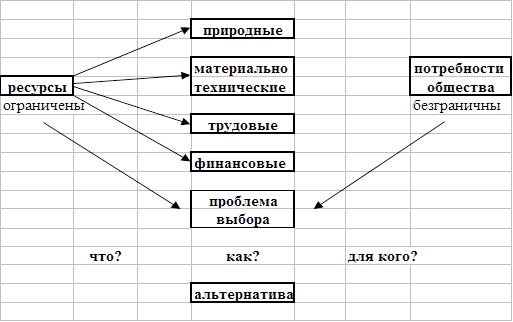 Все экономические ресурсы (природные, материально-технические, трудовые, финансовые) обладают одним свойством – ограниченным количеством, т. е. ресурсов, как правило, меньше, чем необходимо для удовлетворения всех потребностей при данном уровне экономического развития. Вследствие ограниченности ресурсов объём производства также ограничен. Экономическая теория изучает закон ограниченности ресурсов и безграничности потребностей. Что определяет альтернативность их использования. Когда стоит проблема выбора, то возникают три главных вопроса экономики: 1) Что производить? - это принятие решения о том, какие именно блага, какого качества и в каком количестве должны быть произведены. Определяется голосованием по средствам денег покупателя. 2) Как производить? – это принятие решения о том с помощью, каких ограниченных ресурсов и их комбинаций, с помощью каких технологий будут произведены блага. Определяется конкуренцией между товаропроизводителями и конкурентоспособностью товаров (низкие издержки и цена, высокое качество с применением ресурсосберегающей технологии). 3) Для кого производить? – это проблема, решающая кому распределяется и кто потребители. Разрешается соотношением спроса и предложения. Спрос указывает, куда направлять ресурсы, а производитель решает куда выгоднее вкладывать ресурсы для обеспечения максимального дохода и прибыли. Управляя экономикой, приходится выбирать пути использования ресурсов, которые обеспечат удовлетворение наиболее предпочтительных потребностей, т. е. какие товары и услуги следует производить, а от каких придётся отказаться. Производственные возможности общества – это максимальное количество товаров и услуг, которое может быть одновременно произведено за определённый период времени, при данных ресурсах и технологии. Возможности производства книг и станков (средств производства и предметов потребления).