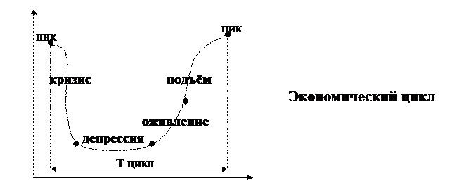 Экономический рост – это количественное увеличение и качественное совершенствование общественного производства. Плюсы: 1) прирост производства и богатства общества; 2) рост международного престижа; 3) повышение жизненного уровня людей; 4) улучшение условий труда; Минусы: 1) ухудшение среды обитания людей; 2) убывание невосполнимых ресурсов; 3) перенаселённость больших городов; 4) проблемы переквалификации кадров; 5) рост интенсивности труда. Различают два пути экономического роста: 1. экстенсивный предполагает простое полное увеличение факторов производства, т.е. вовлечение в экономику ещё не используемых рабочей силы, земли, капитала. 2. интенсивный означает экономический рост за счёт повышения эффективности использования факторов производства (внедрение инноваций, повышение квалификации труда, внедрение ресурсосберегающих технологий…). Для измерения экономического роста применяют два основных взаимосвязанных способа: 1ый состоит в определении степени увеличения общего объёма реального ВНП, ВВП или национального дохода (HD) за определённый период обычно измеряемый в %. 2ой способ – определение степени увеличения ВНП, ВВП, НД на душу населения. Он показывает рост продукта или дохода страны с учётом изменений числа их потребления. Пример: Реальный ВНП в данном году 2100 ед. в предыдущем 2000 ед. Темп роста составил 5% . Численность населения возросла со 100 до 105 человек. 2000/100 = 20 2100/105 = 19,1 Вывод: ВВП вырос на 5%, но на душу населения никакого роста практически нет. Чтобы повысить благосостояние на душу населения необходимо увеличить рост ВНП более высокими темпами. Факторы экономического роста: 1.природные ресурсы , т.е. наличие богатых природных ресурсов благоприятствует хозяйственное развитие страны, однако Япония на много опережает Россию по своему жизненному условию, не имея достаточных ресурсов. Следовательно, важно не только обилие высокого качества природных ресурсов, но и то, на сколько рационально и эффективно они используются. 2.трудовые ресурсы влияют на экономический рост через уровень занятости, качества оборудования и профессиональной подготовки рабочей силы, рациональность её применения, уровень производительности труда, состояние здоровья и прочее. 3. основной оборотный капитал 4. научно – технические знания 5. структура экономики 6. совокупный спрос 7. типы экономической системы 8. социально политически факторы. Тема 4.4: Цикличность развития рыночной экономики . Развитие экономики любой страны происходит волнообразно , т.е. циклически. хозяйственной активности населения, колебания уровня занятости и темпов Экономический цикл – это периодическое изменение деловой производства. Экономический цикл охватывает последовательно сменяющие друг друга фазы: 1. Самой яркой фазой экономического цикла является кризис. Промышленный кризис наступает вследствие нарушения равновесия между совокупным спросом и предложением. Сопровождается всеобщим перепроизводством товаров, рынок переполняется, спрос падает, скапливаются огромные запасы товаров, предприятие по инерции продолжает работать на полную мощность, цены падают, банкротство и крах предприятий, после ликвидации предприятий гибнут банки, кредитные учреждения и вся инфраструктура рынка. 29 октября 1929 года (так называемый «чёрный четверг») в Америке произошёл гранди