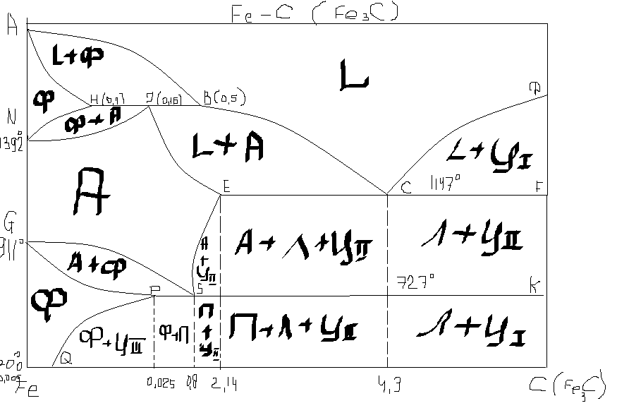 сли заэвтектоидную сталь, содержащую, например, 1% углерода и имеющую структуру перлит + цементит, нагреть выше Аc1, то перлит превратится в аустенит с содержанием 0,8% углерода. Цементит никаких изменений не претерпевает и содержит 6,67% углерода. Дальнейший нагрев в интервале Аc1-Аc3 приводит к тому, что цементит будет растворятся в аустените и дополнительно насыщать аустенит углеродом. В момент достижения температуры Аcm аустенит будет содержать 1% углерода, то есть то количество углерода, которое в стали.
