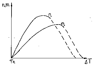корость кристаллизации определяется числом зарождающихся центров кристаллизации n и скоростью их роста m . В отсутствии переохлаждения m,n=0. По мере увеличения степени переохлаждения, происходит увеличение числа центров кристаллизации и скорости их роста, причем число n увеличивается быстрее m. Это связано с тем, что с увеличением степени переохлаждения уменьшается критический размер зародыша и их количество. Однако с увеличением степени переохлаждения уменьшается скорость диффузионных процессов, контролирующих рост зародыша. Практически процесс кристаллизации осуществляется по восходящим ветвям. Нисходящие ветви не реализуются, т.к. металл кристаллизуется при постоянной температуре.