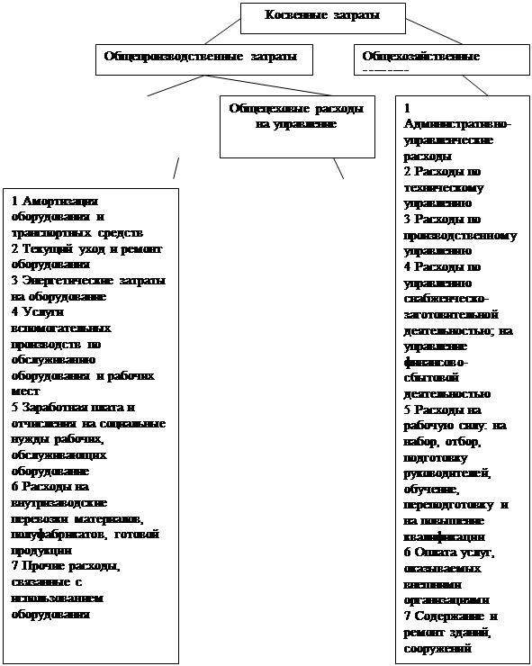 Для определения себестоимости, оценки стоимости запасов и полученной прибыли затраты классифицируются на входящие и истекшие, прямые и косвенные, основные и накладные, производственные и периодические, одноэлементные и комплексные, текущие и единовременные. Входящие затраты – это средства или ресурсы предприятия, которые имеются в наличии и в дальнейшем должны принести доходы. Отражаются в балансе как активы. А средства, израсходованные в отчетном периоде для получения доходов, потерявшие способность приносить доход являются истекшими. Как правило в литературе синонимом термина «затраты» являются входящие затраты, а синонимом «расходы» – истекшие затраты. К прямым расходам относятся прямые материальные затраты и прямые затраты на оплату труда. Эти затраты учитываются на счете 20 «Основное производство». Такой вид затрат непосредственно можно отнести на определенное изделие. Что же касается косвенных расходов, то их невозможно отнести на какое–либо изделие. Эти расходы распределяются согласно выбранной базе распределения между отдельными изделиями. Косвенные расходы могут распределяться пропорционально основной заработной плате производственных рабочих, количеству отработанных станкочасов, часов отработанного времени, объему выпуска продукции и т.п. База распределения косвенных расходов должна отражаться в учетной политике предприятия. Косвенные расходы так же еще называют накладными расходами. Они подразделяются на две группы: общепроизводственные и общехозяйственные расходы и соответственно отражаются на счетах 25 «Общепроизводственные расходы» и 26 «Общехозяйственные расходы». Общепроизводственные затраты включают в себя расходы на содержание и эксплуатацию оборудования и общецеховые расходы на управление. На рисунке 1 представлена классификация косвенных расходов. Расходы на содержание и эксплуатацию оборудования, общецеховые расходы на управление и общехозяйственные расходы имеют не только общие характеристики, но и некоторые различия.