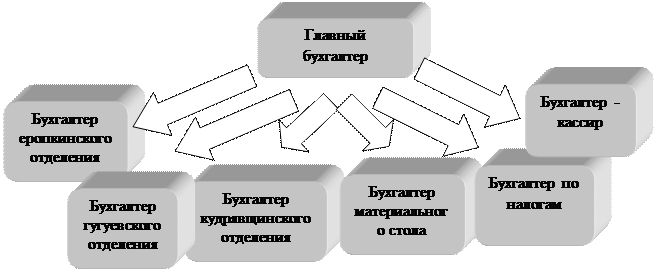 Рисунок 2.2 Структура бухгалтерии СПК «Кудрявщинский» Главный бухгалтер в бухгалтерии является наиболее важным лицом, в связи с этим на него возлагаются следующие функции: - обеспечить полный учёт поступающих денежных средств, товарно-материальных ценностей и основных средств, а также своевременное отражение в бухгалтерском учёте операций, связанных с их движением; - обеспечить точный учёт результатов финансово-хозяйственной деятельности предприятия; - правильно организовать начисление и своевременно перечислить платежи в государственный бюджет, взносы на государственное социальное страхование; - обеспечить составление достоверной бухгалтерской отчетности на основе первичных документов и бухгалтерских записей, представление её в установленные сроки соответствующим органам; - осуществить экономический анализ финансово-хозяйственной деятельности предприятия. Помимо вышеперечисленных функций, главный бухгалтер должен правильно распределять учетную работу между работниками бухгалтерии. Руководителем определяются порядок назначения и увольнения главного бухгалтера, его полномочия. Главным бухгалтером утверждаются график документооборота, формы и сроки сдачи учетных регистров, устанавливаются перечень должностных обязанностей и ответственность бухгалтеров, система разделения их труда. Все это документально закрепляется в Положении о бухгалтерии. В СПК «Кудрявщинский» не разработаны «Положение о бухгалтерии» и график документооборота как отдельные документы. Отсутствие графика документооборота не позволяет организовать работу бухгалтерии максимально рационально. В своей работе бухгалтеры пользуются устаревшими типовыми должностными инструкциями бухгалтеров сельскохозяйственных предприятий. Основным документом организации, определяющим порядок ведения бухгалтерского учета при отражении хозяйственных операций, является Учетная политика. Под учетной политикой понимается выбранная ею совокупность способов ведения бухгалтерского учета: первичного наблюдения, стоимостного измерения текущей группировки и итогового обобщения фактов хозяйственной деятельности. Каждая организация формирует учетную политику самостоятельно, исходя из своей структуры, отрасли и других особенностей деятельности. В соответствии с Положением по бухгалтерскому учету «Учетная политика организации» ПБУ 1/2008 учетная политика в СПК «Кудрявщинский» сформирована главным бухгалтером и утверждена руководителем (прил. 2). Согласно учетной политике бухгалтерский учет в рассматриваемом хозяйстве ведется по мемориально-ордерной форме, сущность которой состоит в том, что на каждую хозяйственную операцию, оформленную первичным документом, либо на группу однородных операций, зарегистрированных в сводном документе (по накопительной группировочной ведомости), составляется мемориальный ордер. Схема записей при данной форме учета представлена в приложении 3. При формировании учетной политики согласно п. 3 ст. 6 Федерального закона «О бухгалтерском учете» утвержден рабочий план счетов (прил. 4) в соответствии с Планом счетов бухгалтерского учета, утвержденным приказом Минфина РФ от 30.10.2000 года № 94-н. Согласно Учетной политике СПК «Кудрявщинский» учет основных средств должен вестись в книгах. Амортизация начисляется как в бу
