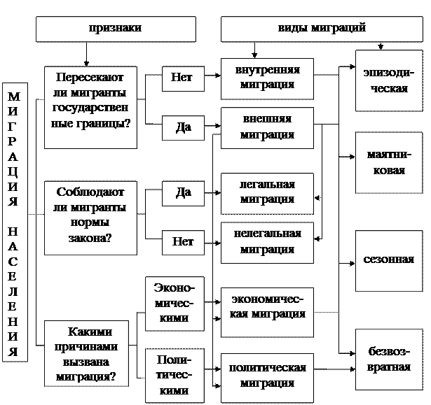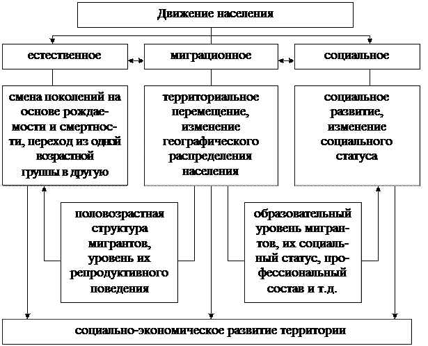 Рис. 1.1 - Виды движения населения Следует отметить, что естественное, миграционное и социальное движение населения тесно взаимосвязаны. Движение населения приводит к его качественным и количественным изменениям. Причем, если естественное и миграционное движение влечёт за собой как количественные, так и качественные изменения, то социальное меняет лишь качественные характеристики. Миграционное движение занимает в этой схеме центральное место, поскольку оно оказывает влияние и на естественное и на социальное движение. Это влияние подробнее будет рассмотрено ниже. Представленная схема показывает, что миграция представляет собой территориальное перемещение населения, которое в свою очередь можно рассматривать как в узком, так и в широком смысле слова. Это сложный процесс, состоящий из множества событий. Он состоит из взаимодействия двух потоков: выбытия населения из одного пункта и прибытия туда мигрантов из других местностей. В узком смысле миграция представляет собой законченный вид территориального перемещения, завершающийся сменой постоянного места жительства, то есть в буквальном смысле слова означает переселение [19, с. 19]. Миграция в широком значении этого слова представляет собой территориальное перемещение, совершающееся между разными населенными пунктами одной или нескольких административно-территориалъных единиц, независимо от продолжительности, регулярности и целевой направленности. Используя различные признаки, выделяют несколько видов миграции населения. По целям, которые преследует население при перемещении из одного населенного пункта в другой, выделяют эпизодическую, маятниковую, сезонную и безвозвратную миграции. Эпизодические миграции представляют собой деловые, рекреационные и иные поездки, совершающиеся не только не регулярно по времени, но и необязательно по одним и тем же направлениям [20, с. 6]. В деловых поездках участвует трудоспособное население. Данный вид миграции отличается разнообразием состава участников. По своим масштабам он, видимо, превосходит все остальные. Если не брать во внимание туристические поездки, то изучение эпизодических миграций ведётся весьма слабо. Маятниковые (челночные) миграции представляют собой ежедневные или еженедельные поездки населения от мест жительства до мест работы (учёбы) и обратно, расположенных в разных населенных пунктах. Участниками маятниковых миграций во многих странах является значительная часть городского и сельского населения. В основном, перемещения происходят между пригородами и городами.Этот вид миграции влияет количественно и качественно на трудовые ресурсы поселений — центров притяжения, где число рабочих мест превышает собственные ресурсы труда или не соответствует профессионально-квалификационной структуре населения. Сезонные миграции - это перемещения, главным образом, экономически активного населения к местам временной работы и жительства на срок в несколько месяцев, с сохранением возможности возвращения в места постоянного жительства. Сезонные миграции повышают реальный жизненный стандарт и удовлетворяют потребности производства, испытывающего дефицит рабочей силы. Возникновение подобных миграций связано с тем, что в экономике ряда районов доминируют отрасли, в которых потребность в рабочей силе неравном