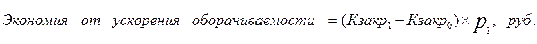 В результате ускорения оборачиваемости возникает экономия средств, относительно высвобожденных из оборота (иными словами, оборотные средства выводятся из менее ликвидных – материальных форм в более ликвидные - финансовые). Размер этой экономии определяется по формуле: