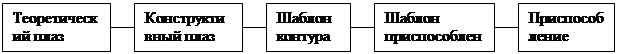 1 – пояс нервюры; 2 – стенка нервюры; 3 – упор приспособления. В данном сечении строим размерную цепь, в которой замыкающее звено – это размер погрешности, которую хотим определить, а составляющие звенья – это размеры, точность которых влияет на погрешность искомого размера. LСЕ = LП – LБ , Здесь LCE – замыкающее звено; LП – размер приспособления; LБ – величина зазора между поясом узла и фиксатором приспособления, характеризующая погрешность базирования. Погрешность узла определяется формулой δСЕ = δП + δБ . Погрешность базирования величина очень малая и из статистики δБ = -0,05±0,1 мм. Для того, чтобы найти δП , необходимо знать как настраивается приспособление. приспособление настраиваем с помощью шаблонов приспособления, где шаблон приспособления – это лист с контуром, выполненным по заданной поверхности. Погрешность приспособления δП находиться из рассмотрения его схемы увязки: