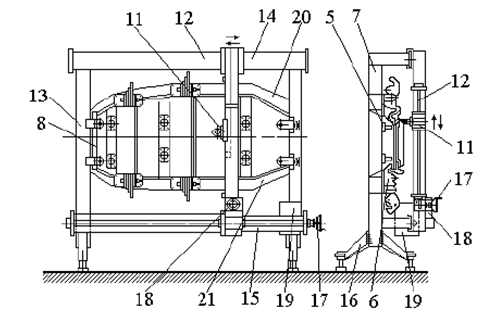 4.2. Разработка ТУ на проектирование приспособления Сборочное приспособление – устройство, обеспечивающее определенное взаимное расположение, фиксацию и соединение деталей и сборочных единиц (панелей, узлов, секций, отсеков) самолета с заданной точностью. Оно позволяет: собрать из нежестких элементов конструкции жесткую сборочную единицу самолета с заданной точностью и с учетом конструктивно – технологических требований к ним; обеспечить взаимозаменяемость сборочных единиц, как по контуру, так и частично по разъемам; повысить производительность труда на сборочных работах. Приспособление проектируется на основании технического задания. Техническое задание должно содержать следующие сведения: - назначение приспособления; - основные требования к приспособлению (метод сборки, освещение, оборудование, температура, давление, в которых будет работать приспособление); - указания на основные технологические базы и фиксирующие элементы с перечислением узлов и деталей, фиксируемых в приспособлении; - краткая последовательность технологического процесса сборки; - указание на взаимозаменяемые элементы и сопрягаемые поверхности и степени точности их изготовления; - вид механизации приспособления (пневматика, механические зажимы, противовесы и т. д.); - указание по единству баз, в приспособлениях и стапелях для сборки смежных узлов и агрегатов; - указания: передвижная, вращающаяся, стационарная и т.д. - для разъемного приспособления способ разъема (ручной, механизированный, другой). При проектировании приспособления конструктор обязан руководствоваться: - технологическим заданием на данное приспособление; - чертежами на собираемые узлы, агрегаты, на входящие в их состав детали и ТУ к ним; - перечнем средств увязки к данному приспособлению (эталоны, макеты, шаблоны и т.д.); - перечнем готовых изделий; При изготовлении приспособления: - руководствоваться конструкторской документацией; - к изготовлению сборочного приспособления допускаются рабочие, имеющие квалификационный разряд не ниже разряда работы; - для контроля изготовления и приемки деталей и узлов приспособления применять только аттестованные средства контроля. Технические требования: Сборочное приспособление состоит из элементов каркаса (стойки 13, направляющих рам 14 и 15 и опоры 16). На направляющих рамах 14 и 15 установлена траверса 12, а на траверсе установлена сверлильная головка 11. Движение траверсы и сверлильного агрегата осуществляется вручную маховиками 17 или автоматически по программе с помощью приводов 18 и 19. На дополнительных поперечных рамах 20 и 21 установлены пакеты пластинчатых откидных фиксаторов 6 и 7. Базовые поверхности фиксаторов выполнены в соответствии с внешними контурами поясов 2 и 3 и стенки 1 нервюры, собираемой в данном СП. На каждом откидном фиксаторе указан номер нервюры, соответствующий фиксатору. Пакет откидных пластинчатых фиксаторов снабжен эксцентриковым зажимом 22, предназначенным для закрепления требуемого фиксатора в рабочем положении. Перенастройка СП для сборки следующей нервюры осуществляется заменой одного комплекта фиксаторов 6 и 7 на другой комплект соответствующего типоразмера нервюры в соответствии с указанной на них информацией.