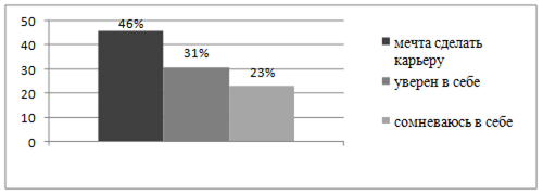 Полученные числовые значения характеризуют выраженность определенного типа личности по классификации Дж. Холланда. В чистом виде эти профессиональные типы встречаются редко – обычно можно говорить только о преобладающем типе личности. Анализ полученных данных производится путем выделения столбца, содержащего наибольшее количество отмеченных ответов и соответствующих определенному типу личности по Дж. Холланду (Приложение Е). 2. 2 Обработка и интерпретация результатовПопробуем проанализировать результаты, полученные в ходе исследования и провести соответствующую интерпретацию. Первым этапом в обработке полученных материалов был проведен анализ данных по профориентационной анкете. Рассмотрим, какие стереотипы движут старшеклассниками в рассмотрении наиболее важных для них вопросах самоопределения. На вопрос анкеты «Вы определились с планами на будущее после школы?» свыше 75% опрошенных старшеклассников ответили утвердительно, остальные не определились в выборе. Можно предположить, что это связано со многими социальными факторами: многообразием мира профессий и сложной ориентацией в нем, трудностью в выборе учебного заведения, зависимостью от решения родителей, неадекватностью самооценки и др. Оценка школы старшеклассниками не считают свой школьный опыт достаточными для построения будущей карьеры. На вопрос анкеты: «Считаете ли Вы школьный опыт достаточным для построения будущей карьеры?» Количество ответивших: «Я сам строю свою карьеру» составило 50%; Позиция «Успешная учеба в школе еще не дает никаких гарантий успеха в будущем» тоже имеет высокие показатели в ответах старшеклассников – 39%. Лишь 11% опрошенных согласны с утверждением. Получается так, что школа не является достаточным основанием для будущей карьеры, собственная успешная учеба также не дает никаких гарантий, следовательно, обесцениваются собственные достижения и школьный социальный опыт, на основании которых можно строить планы. Анализируя проблему профессионального самоопределения старшеклассников, важно оценить уровень деятельностного компонента планирования. На вопрос анкеты «Как Вы относитесь к карьере?» предлагалось три варианта ответа: «мечта сделать карьеру» (как низкий уровень планирования), уверенность в своих силах (как высокий уровень) и сомнения в своих силах (как промежуточный уровень). Уверены в своих силах и стремятся к карьере 31% молодежи; 46% молодых людей также задумываются о карьере, но пока только на уровне мечты; 23% школьников не уверены в своих силах (Диаграмма 1).