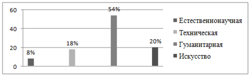 Диаграмма 1 Отношение молодежи к карьере При анализе направленности в достижении успехов в карьере современной молодежью можно заметить, что наибольшее число ответивших выбрало ответ, предполагающий иногда и противоправный метод (46%). Наименьший процент учеников, а их 15%, придерживается утверждения: «только честно зарабатывая». Анализ данных показывает, что старшеклассники проявляют большую склонность к гуманитарным дисциплинам и искусству (Диаграмма 2).