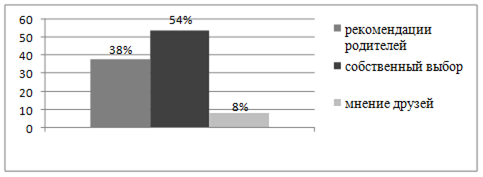 Диаграмма 4 Основные источники информации о профессиях Значительная доля школьников руководствуется собственным выбором при выборе профессии (Диаграмма 5). Можно предположить, что эти показатели вызваны ростом самостоятельности подростков.