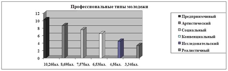 Таким образом, рассчитывая коэффициент ранговой корреляции Спирмена по каждой профессии, оказалось, что корреляция не достигает статистической значимости между стереотипами молодежи и взрослых в наибольшей степени по отношению к профессиям «менеджера», «программиста», «журналиста», «юриста», «инженера». Это подтверждает наличие стереотипа молодежи об этих профессиях как о наиболее привлекательных. Полученные материалы свидетельствуют о том, что сфера профессиональной ориентации вскрывает характерные особенности самоопределения в юношеском возрасте, моделируя структуры сознания, обусловливающие особенности идеализации и социальной идентификации личности в этом возрасте. Данное обстоятельство принципиально важно учитывать при организации работы по профессиональной ориентации. Здесь крайне важно не только вскрыть психологические характеристики, необходимые для данной деятельности, но и показать тот образ и стиль жизни, те социальные типы с их ценностными установками, которые стоят за той или иной профессией. Это тем более необходимо, поскольку, как показывает наше исследование, за каждой профессией юноши видят тот или иной социально ценностный контекст. Следующая методика - методика «Профессиональной напрвленности Дж. Холланда», была проведена с целью определения профессиональной направленности группы молодежи, а именно учащихся 10-11-ых классов. С ее помощью мы определили доминирующие профессиональные типы (Диаграмма 6).