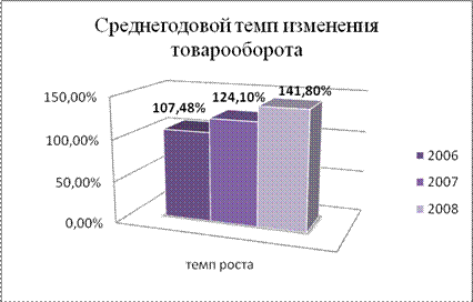 Значительно увеличился объем товарооборота – на 17030,5 тыс. руб. (на 41,8 % по сравнению с предшествующим годом). Издержки обращения увеличились на 7,3%, однако их уровень в 2008 году по сравнению с предшествующим годом уменьшился (на 24,4 %), это оценивается положительно. Рост прибыли от продаж (в сумме на 8 тыс. руб.) обеспечен увеличением товарооборота (на 17030,5 тыс. руб.) и снижением уровня издержек обращения (на 24,4 %). Таким образом, расчеты, приведенные в таблице 1, показывают, что ООО “Глобус ” развивается вполне успешно. Приведем динамику основных финансово-экономических показателей деятельности ООО “Глобус ”, предварительно выстроив их по возрастанию темпов роста. - прибыль от продаж (120,5%); - товарооборот (141,8%); Увеличение данных показателей объясняется ростом уровня доходов и уменьшением уровня издержек обращения. 2.2. Анализ товарооборота ООО “Глобус ” Анализ товарооборота произведен в следующей последовательности: 1. Оценка выполнения плана товарооборота ООО “Глобус” имеет следующие данные по объему и составу товарооборота (табл. 2.). Таблица 2. Информация о выполнении плана по общему товарообороту ООО “Глобус ” за период с 2007 по 2008 года, тыс. руб.