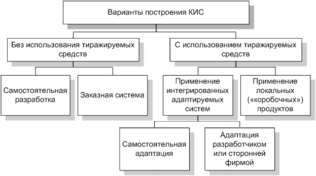 3. Задачи и подходы к созданию КИС При создании комплексной системы автоматизации управления предприятием должны быть решены следующие основные задачи: 1. создание или оптимизация единой системы планирования деятельности предприятия, основанной на учетных процедурах и дополненной эффективным механизмом управления: 2. постановка или оптимизация внутренней учетной политики предприятия с детализацией, обеспечивающей управленческий учет и объективный анализ результатов финансово-хозяйственной деятельности; 3. поддержка принятия решений на всех уровнях управления на основе совершенствования процессов сбора и обработки различных видов информации; Частные задачи, решаемые КИС, во многом определяются областью деятельности, структурой и другими особенностями конкретных предприятий. Необходимо выявить примерный перечень задач, которые должна решать КИС на различных уровнях управления предприятием. Руководство предприятия: 1. обеспечение достоверной информацией о финансовом состоянии компании на текущий момент и прогнозе на будущее; 2. обеспечение контроля сверху донизу за работой предприятия, желательно с возможностью выявления конкретного лица, допустившего ошибку; 3. обеспечение четкой координации работ и ресурсов; 4. предоставление оперативной информации о негативных тенденциях, их причинах и возможных мерах по исправлению ситуации; 5. формирование полной картины себестоимости конечного продукта (услуги) по компонентам затрат; 6. устранение случаев «переплаты» налогов, связанных с ошибками или особенностями учета; Финансово-бухгалтерские службы: 1. полный контроль за движением средств; 2. реализация необходимой учетной политики; 3. оперативное определение дебиторской и кредиторской задолженности; 4. контроль за выполнением договоров, смет и планов; 5. контроль за финансовой дисциплиной; 6. отслеживание товарно-материальных потоков; 7. оперативное получение набора документов финансовой отчетности (бухгалтерской и др.); 8. налоговое и бюджетное планирование; Управление производством: 1. контроль за выполнением производственных заказов; 2. формирование информации о состоянии производственных мощностей; 3. контроль за технологической дисциплиной; 4. ведение документов для сопровождения производственных заказов (например, заборные карты, маршрутные карты и др.); 5. определение фактической себестоимости производственных заказов; Службы маркетинга и рекламы: 1. работа с существующими и потенциальными заказчиками (клиентами); 2. ведение статистики продаж; 3. информационная поддержка политики цен и скидок; 4. использование базы стандартных писем для рассылки, с сохранением даты и типа письма каждого отправления; 5. контроль за выполнением поставок заказчику в нужные сроки, при сбережении затрат на транспортировку; Службы сбыта и снабжения: 1. ведение баз данных товаров, продукции, услуг; 2. планирование сроков поставки и затрат на транспортировку; 3. оптимизация транспортных маршрутов и способов транспортировки; 4. ведение контрактов (в том числе со сложными платежами и сроками поставок); Службы складского учета: 1. управление многозвенной структурой складов; 2. оперативный поиск товара (продукции) по складам; 3. оптимальное размещение на складах с учетом условий хранения; 4. управление поступлениями с учетом контроля качества; 