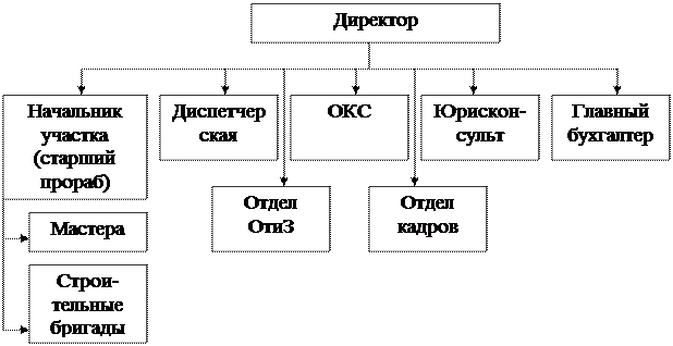 Рис. 1 Структура управления Диспетчерская – принимает заказы на строительные услуги. Юристконсульт – ведет претензионно-исковую работу. Главный бухгалтер – ведет бухгалтерию предприятия, взаимодействует с налоговой инспекцией, составляет статические формы отчетности предприятия. Отдел кадров – осуществляет работы по приему, переводу и увольнению сотрудников. Отдел труда и заработной платы – разрабатывает положения по оплате труда и заработной платы. Начальник участка – осуществляет строительно-монтажные работы. Структура ОКС состоит из следующих подразделений: – бюро (сектор, группа) технического надзора за проведением работ по капитальному строительству; – бюро (сектор, группа) учета и обеспечения финансирования работ по капитальному строительству; – бюро (сектор, группа) комплектации и обеспечения оборудованием строящихся и действующих объектов; – бюро (сектор, группа) планирования капитального строительства; – проектно-конструкторское бюро (сектор, группа); – отдельные специалисты. Задачи ОКС: 1. Организация строительства и реконструкции производственных мощностей. 2. Организация строительства и реконструкции вспомогательных объектов культурно-бытового назначения. 3. Обеспечение своевременного ввода новых объектов в эксплуатацию. 4. Экономия средств предприятия за счет эффективного использования капитальных вложений, сокращения объемов незавершенного строительства и рационализации работы всех структурных подразделений отдела. Функции ОКС: 1. Разработка проектов долгосрочных, среднесрочных и текущих планов капитального строительства. 2. Составление титульных списков на все объекты капитального строительства, заявок на строительные материалы и оборудование. 3. Разработка планов ввода новых производственных мощностей и культурно-бытовых объектов. 4. Заключение договоров с проектными организациями и подрядчиками на разработку проектно-сметной документации и строительство объектов. 5. Согласование графиков проектных и строительных работ. 6. Организация подготовки строительных площадок. 7. Согласование с органами, осуществляющими технический надзор, вопросов, связанных с установкой, испытанием и регистрацией оборудования на строительных площадках. 8. Финансовое обеспечение строительно-монтажных работ. 9. Планирование снабжения объектов строительства материалами и оборудованием. 10. Выполнение планов капитального строительства. 11. Своевременная выдача проектно-сметной и технической документации для производства строительных работ. 12. Технический надзор за сроками и качеством выполнения работ, за их соответствием утвержденной проектно-сметной документации, рабочим чертежам, строительным нормам, стандартам, нормам техники безопасности, производственной санитарии, требованиям рациональной организации труда. 13. Подготовка документации по завершенным объектам для приемной комиссии. 14. Контроль за своевременным вводом объектов в эксплуатацию. 15. Учет незавершенного строительства. 16. Определение потребности в строительстве новых производственных мощностей и культурно-бытовых сооружений. 17. Подготовка материалов, необходимых для экономического обоснования необходимости строительства новых объектов. 18. Организация консультаций по решению отдельных строительных вопросов. 19. Участие в общем