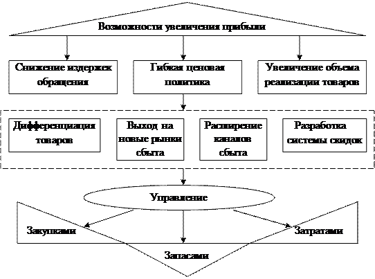 Рис. 4 Возможности увеличения прибыли ООО "САРЕТ" Управление затратами заключается в анализе затрат и поиск путей их снижения. Управление запасами заключается в поиске способа наиболее рационального способа хранения товарных запасов, расчета оптимальной партии заказа, поддержание товарных запасов в нормативных размерах, избегания затоваривания складских площадей. Возможности, выделенные на рис. 3 могут быть показаны ООО "САРЕТ" для увеличения прибыли, но в силу сложившейся обстановки на рынке строительных материалов, характеру конкуренции и стадий жизненного цикла товаров, выпускаемых данным предприятием, не все являются одинаково эффективными, например правление закупками и затратами являются более необходимыми, чем управление запасами, т.к. ООО "САРЕТ" работает в основном под заказ. Для выделения приоритетных направлений, полученных в результате SWOT- анализа производится с использованием метода анализа иерархий. Метод анализа иерархий — представляет собой метод согласования результатов, полученных с использованием различных методов оценки, и основанных на декомпозиции проблемы согласования результатов и ее представления в виде иерархии. Данный метод реализуется в ходе следующих этапов: 1. Выявляются приоритеты в критериях, путем их попарного сравнения. Для этого строится обратносимметричная матрица, а для попарного сравнения используется шкала отношений важности критериев оценки, где 1 – одинаковая важность, 3 – незначительное преимущество, 5 – значительное преимущество, 7 – явное преимущество, 9 – абсолютное преимущество. 2. Далее для каждого критерия определяется вес по формуле: n W´j = Σ ( Па ij )1/n , (1) i = 1 где аij — важность критерия (индекса). 3. Полученные веса нормируются W ´´ ij = W ´ j / Σ Wj , (2) Полученные таким образом величины и представляют собой итоговое значение весов каждого из критериев. 1. Проводится реализация описанной процедуры выявления приоритетов по каждому критерию. Таким образом, определяются значения весов каждой альтернативы. 2. Производится расчет итоговых весов каждой альтернативы, которые равны сумме произведений весов ценообразующих факторов и соответствующих им весов альтернатив по каждому фактору. 3. Производится расчет рыночной стоимости одной акции, которая равна сумме произведений значений альтернатив и соответствующих им весов. Результаты расчета приоритетов увеличения суммы прибыли для ООО "САРЕТ" приведены в таблице 2. Таблица 2 Приоритеты возможностей увеличения сумма прибыли ООО "САРЕТ"