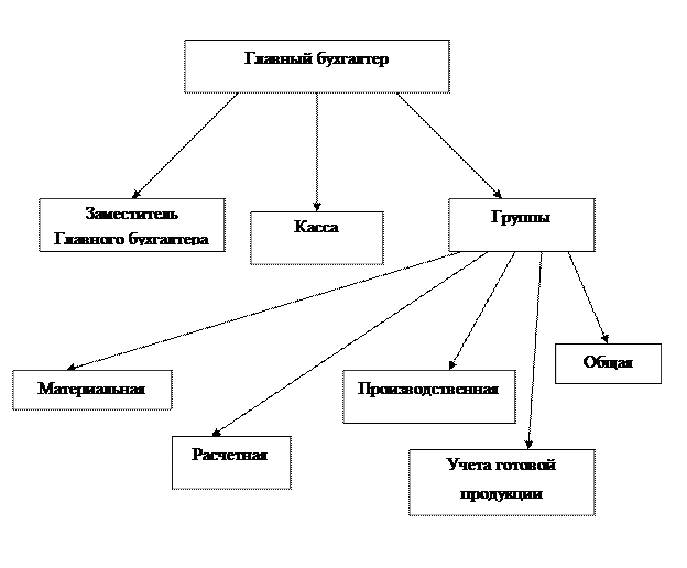 Рис 1. Структура бухгалтерского аппарата Материальная группа отвечает за учет приобретения материальных ценностей, их поступления и расходования. Расчетная группа осуществляет учет затрат труда рабочих, исчисление заработной платы работникам, контроль за использованием фонда оплаты труда, учет всех расчетов с работниками предприятия, бюджетом. Фондом социального страхования и другими ведомствами, связанными с оплатой труда. В производственной группе ведется учет затрат на производство, калькулируется себестоимость продукции, составляется отчетность о производстве. В группе по учету готовой продукции осуществляется учет готовой продукции на складах и ее реализации. Работники общей группы ведут учет остальных операций и Главную книгу, составляют бухгалтерский баланс и другие формы финансовой отчетности. Ответственность за организацию делопроизводства, состояние и достоверность бухгалтерского учета, статистической и финансовой отчетности несет директор общества. Руководство ведением бухгалтерского учета в обществе возложена на главного бухгалтера, деятельность которого регламентирована должностной инструкцией. 2.2. Синтетический учет расчетов с персоналом по оплате труда Для ведения расчетов с персоналом предприятия по оплате труда, а также по выплате доходов по акциям и другим ценным бумагам в бухгалтерском учете используется пассивный счет 70 «Расчеты с персоналом по оплате труда». По кредиту данного счета отражают начисление заработной платы, причитающиеся работникам - в корреспонденции со счетами учета затрат на производство (расходов на продажу) и других источников, пособий по социальному страхованию, пенсий и других аналогичных сумм – в корреспонденции со счетом 69 «Расчеты по социальному страхованию и обеспечению», а также начисление работникам доходов от участия в капитале организации и т.п. – в корреспонденции со счетом 84 «Нераспределенная прибыль (непокрытый убыток)». По дебету счета отражаются выплаченные суммы заработной платы, премий, пособий и т.п., доходов от участия в капитале организации, а также суммы начисленных налогов на доходы работников, суммы, удержанные из заработной платы по исполнительным документам, и другие удержания. Кредитовое сальдо по данному счету отражает задолженность предприятия перед работниками по начисленной, но не выданной заработной плате. Синтетический учет заработной платы осуществляется путем группировки и суммирования аналитических показателей в составе фонда заработной платы, фактически сложившегося за каждый отчетный период (включая отчетный год). Аналитический учет носит персональный характер и организуется в разрезе каждого табельного номера работника, а синтетический фиксирует его суммы, объединяя их в составе счета 70 «Расчеты с персоналом по оплате труда». Использование тех или иных учетных регистров в синтетическом учете зависит от применяемой формы бухгалтерского учета на предприятии. При начислении заработной платы и других выплат работникам необходимо правильно определить их источники. Существует несколько видов таких источников. 1) Выплата зарплаты может осуществляться за счет отнесения начисленной заработной платы на себестоимость продаваемой продукции, товаров, работ, услуг. При включении выплат в себестоимость продукции (раб