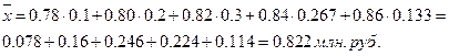 Рис. 1. Гистограмма распределения организаций по уровню затрат на рубль продукции Моду также можно рассчитать по формуле: М0 =хM 0 + iM 0 (fM 0 - fM 0 -1)/ ((fM 0 - fM 0 -1)+( fM 0 - fM 0 +1)) где М0 – мода; хM 0 – нижняя граница модального интервала; iM 0 – величина модального интервала; fM 0 – частота модального интервала; fM 0 -1 – частота модального интервала, предшествующего модальному; fM 0 +1 – частота интервала, следующего за модальным. М0 = 0,81+0,02(9-6)/((9-6)+(9-8))=0,825 млн.руб. Значение моды говорит о том, что наиболее часто встречается показатель уровня затрат на рубль продукции в организациях в пределах 0,825 млн.р. Медиана находится в пределах 0,815 млн. руб. 3. Рассчитать характеристики ряда распределения: среднюю арифметическую, среднее квадратическое отклонение, коэффициент вариации Расчет характеристик ряда распределения: a) Средняя простая арифметическая: