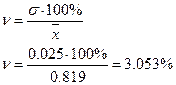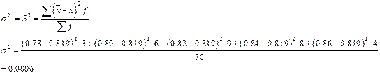Коэффициент вариации равен 3,053 % , надежен, так как меньше 33%. Анализ: среднеквадратическое отклонение 0,025 или с коэффициентом вариации 3,053% говорит о том, что средняя величина 0,819 в ряду распределения типичная и надежная, а сама совокупность однородна. Из оценочной шкалы колеблемости признака видно, что в данной задаче незначительная колеблемость показателя в ряду распределения,т. к.: