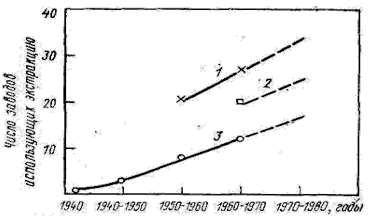 Рис.1.1.1 Рост производства и переработки урана с применением экстракции: 1 - извлечение из руды; 2 - вторичная переработка; 3 - перечистка. В 1942-1953 гг. при рафинировании урана применяли экстракцию нитрата уранила эфиром. С 1953 г. этот экстрагент заменили ТБФ, который применяется до сих пор. Для извлечения урана из руд экстракцию применяют с 1955 г., используя вначале Д2ЭГФК, а с 1957 г. вторичные и третичные амины (в последние годы). Процесс экстракции аминами был разработан в Окриджской национальной лаборатории. Он известен как процесс Атех. Третичные амины селективно извлекают уран в присутствии таких примесей, как железо, торий, фосфаты и редкие земли. Процесс Dapex с применением Д2ЭГФК был использован первоначально для извлечения урана из руд. Однако, экстрагент Д2ЭГФК менее селективен по отношению к урану в присутствии примесей, таких как окисное железо и редкоземельные металлы. При экстракции аминами селективность экстракции зависит от типа амина. Для третичных аминов отмечается более высокое насыщение по сравнению с вторичными аминами (рис.1.1.2)