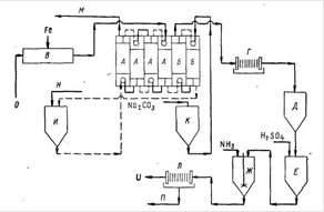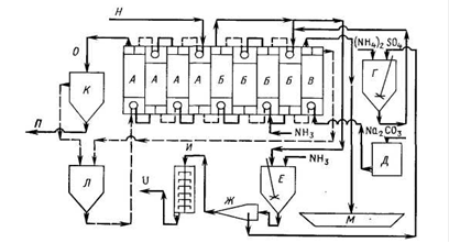 Рис.1.1.8 Схема получения урана на заводе фирмы "Kerr - Me Gee": А - экстракция, Б - реэкстракция, В - восстановление железа, Г - фильтрация реэкстракта, Д - реэкстракт, Е - подкисление, Ж - осаждение, И - экстрагент, К - раствор для реэкстракции, Л - фильтрация продукта, М - рафинат, Н - Д2ЭГФК и ТБФ в керосине, О - раствор после выщелачивания. Перед экстракцией осветленный раствор вводят в контакт с металлическим железом для восстановления окисного железа в закисное. Экстракцию проводят в четырех ступенях смесителя-отстойника раствором, содержащим 0,1 М Д2ЭГФК и 0,1 М ТБФ в керосине. Соотношение потоков регулируют так, что концентрация