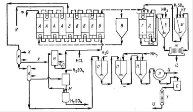 Рис.1.1.21Схема извлечения урана из фосфорной кислоты, разработанная "International Minerals and Chemical Corp. ": A - исходная фосфорная кислота, Б - восстановление железа, В - экстракционный смеситель, Г - центрифуга для разделения фаз, Д - смеситель для реэкстракции и осаждения, Е - центрифуга для разделения фаз после реэкстракции, Ж - экстрагент, И - фильтрация, К - плоская сушилка с мешалкой, Л - добавление экстрагента, М - переработка фосфорной кислоты Рассмотрено использование синергетной смеси ди (октилфенил) фосфорной кислоты (ДОФФК) и дибутилбутилфосфоната (ДББФ) для экстракции урана (VI) из раствора фосфорной кислоты. Моно (октилфенил) фосфорная кислота эффективна только для экстракции урана (IV). Добавка ДОФФК и ТБФ улучшает экстракцию и разделение фаз. Показано, что при использовании смеси ДОФФК и ДББФ-коэффициент экстракции уменьшается с увеличением концентрации фосфорной кислоты. Даже при концентрации фосфорной кислоты 5,8 М коэффициент экстракции составляет 1,5, если органический раствор 0,2 М ДОФФК + 0,1 М ДББФ в керосине контактируют с раствором, содержащим В последние несколько лет разработаны два процесса, которые Можно использовать для извлечения урана из фосфорной кислоты, получаемой мокрым методом. Эти процессы состоят из двух стадий. На первой стадии уран концентрируется от 180 мг/л до 12 г/л. В первом процессе синергетный эффект достигается применением смеси Д2ЭГФК и ТОФО, которая экстрагирует шестивалентный уран. Во втором процессе смесь моно - и диоктилфенил-фосфорной кислот экстрагирует четырехвалентный уран. Получаемый раствор фосфата урана перерабатывается на следующей стадии с использованием той же смеси экстрагентов. Оба метода были успешно опробованы на лабораторной установке. Процесс Д2ЭГФК-ТОФО рассмотрен ниже и иллюстрируется на рис.1.1.22