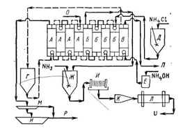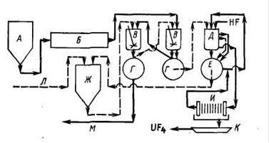 Рис.1.1.20. Схема азотнокислотной переработки концентрата, разработанная фирмой "Palaboro": А - азотнокислый раствор после выщелачивания, Б - экстракция, В - промывка, Г - обработка кислотой, Д - обработка содой, Е - реэкстракция, Ж - осаждение диураната аммония, И - фильтрация, К - обработка рафината, Л - возврат кислоты на выщелачивание, М - прокаливание Уран из реэкстракта выделяют в виде диураната аммония с помощью газообразного аммиака. Продукт после прокаливания содержит <0,6% Th по отношению к 25 - В последние годы для получения урана применяют подземное выщелачивание с последующей очисткой растворов. Для подземного выщелачивания применяют серную кислоту и карбонатные растворы. В лабораториях CANMET были успешно проведены лабораторные работы. Исследовались также растворы, полученные подземным выщелачиванием и из руды, извлеченной на поверхность. Урановые растворы получают как подземным выщелачиванием, так и выщелачиванием добытой взрывным способом руды на поверхности. Для выщелачивания применяют сульфат окиси железа с бактериальными агентами (thiobacillus ferroxidans). Осветленный раствор после выщелачивания перерабатывают методом непрерывного ионного обмена в колоннах Химсли. Смолу элюируют серной кислотой и элюат перерабатывают по схеме Eluex. Уран экстрагируют и очищают с помощью третичного амина. После реэкстракции уран выделяют осаждением аммиаком. Для подземного выщелачивания через буровые скважины обычно применяют раствор карбоната аммония с окислителем - кислородом или перекисью водорода. Уран из осветленных растворов извлекают методом непрерывного ионного обмена. Растворы после выщелачивания содержат 0,05-0,15 г/л Другим примером извлечения урана из бедных растворов является получение урана из растворов медного производства после цементации меди. Уран из растворов с содержанием - 10 мг/л извлекают методом ионного обмена, а из ионообменной смолы - серной кислотой. Получают сульфат уранила с небольшими количествами других ионов. Уран очищают экстракцией Д2ЭГФК. Были проведены широкие исследования с целью разработки методов извлечения следовых количеств урана из различных производственных растворов. Например, Горным Бюро США описан процесс извлечения урана из отработанных растворов после кучного выщелачивания медных руд с помощью экстракции или ионного обмена. Органический раствор, содержащий 2% третичного амина и 1% изодеканола в керосине, контактируют с исходным раствором, содержащим, г/л: 0,01 - Кроме руд с относительно высоким ( Температура исходной фосфорной кислоты, поступающей в узел извлечения урана ~ 66 °С. После охлаждения раствор, содержащий гипсовый осадок, контактируют с железным скрапом в барабанах из нержавеющей стали. При этом окисное железо переводится в закисную форму. Величина ЭДС после составляет 0,0 мВ. Так как в процессе экстракции разделение фаз происходит медленно и имеется тенденция к эмульгированию, применяют центрифугирование. При использовании для экстракции 5% -ного раствора алкилпирофосфата насыщение Продукт отделяют от органического раствора центрифугированием. Конечный сырой тетрафторид урана содержит ~50% Поэтому для заводов такого типа требуется очень тщательный подбор оборудования, чтобы единовременные вложения экстрагента были как можно меньшими. Схема процесса представлена на рис.1.1.21