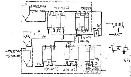 Рис.1.1.22. Извлечение урана из фосфорной кислоты, полученной мокрым способом: Э - экстракция, РЭ - реэкстракция, Р - рафинат, ПУ - на производство удобрений. О/с - окисление, В - восстановление, Пр - прокаливание, П - промывка, Вщ - на выщелачивание Кислота в мокром процессе содержит 5-6 М фосфата 0 2 - 3,5 г/л Fe