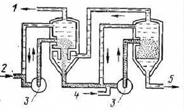 Рис.1.1.23 Конечные ступени насоса - отстойника с потоками водного и органического растворов: 1 - экстракт (ТБФ + гексан + нитрат уранила) - на стадию промывки, 2 - исходная пульпа (азотная кислота + нитрат уранила); 3 - насос; 4 - экстрагент (ТБФ + гексан), 5 - пульпа - рафинат, азотная кислота Концентрация экстрагента составляет 28-32%, а температура исходной пульпы 37 - 52 °С. Отклонение соотношения потоков в насосах-декантаторах от нормы более чем на ±5%, приводит либо к плохому извлечению урана, либо к повышенной экстракции примесей. Промывку и реэкстракцию проводят также, как в процессе. Fernald - в пульсационных колоннах, потому, что для процесса требуется большое число ступеней и выбор иного оборудования привел бы к значительному увеличению капитальных затрат. У ситчатых пластин отверстия увеличенного диаметра, а поверхность, которая смачивается преимущественно диспергированной органической фазой, покрыта фторопластом. В результате таких видоизменений достигнута втрое большая производительность установки по сравнению с установкой Ferland где в качестве разбавителя используется керосин. Так как технологические процессы аффинажа урана на основе ТБФ и азотной кислоты на различных заводах сходны, здесь будет подробно рассмотрен только один завод фирмы "Eldorado Nuclear" в Канаде, в значительной степени сходный с вышеописанным аффинажным заводом Fernald в Великобритании. Аффинаж всех урановых концентратов, получаемых на рудо-перерабатывающих заводах Канады, производится в г. Порт Хоуп. Там в 1962 г. была начата разработка аффинажного процесса с целью получения материала ядерной чистоты. Предварительные исследования показали, что наилучшая чистота может быть достигнута прямым разложением исходного материала с последующей экстракционной переработкой раствора. При выщелачивании концентратов азотной кислотой получают раствор, содержащий ~ 300 г/л урана, концентрации 3 н. по свободной азотной кислоте и имеющий плотность 1,6 г/мл. Экстракцию урана из этого раствора ведут в трех пульсационных колоннах диаметром 560 мм. Схема процесса представлена на рис.1.1.24. Нитрат уранила 300 г/л при расходе 20,8 л/мин поступает на экстракцию. Раствор содержит примеси других металлов, таких, как торий, молибден, ванадий, а также примеси сульфата и арсената. Органический раствор представляет 25% -ный раствор 1 ТБФ в керосине. Экстракция ведется в пульсационной колонне, высотой 10,9 м с шестью эквивалентными ступенями при О/В = 4. Соотношение потоков регулируют так, чтобы достигалось насыщение экстрагента ураном. Это способствует уменьшению экстракции тория и других примесей.