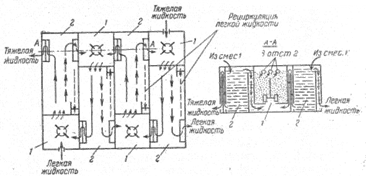 Рис.1.2.1 Схема ящичного смесительно-отстойного экстрактора: 1 - смеситель; 2 - отстойник Объем отстойника является критическим фактором в конструкциях смесителей - отстойников. Он определяется ограничениями, налагаемыми скоростью коалесценции дисперсной фазы. Обычно дисперсная фаза стекает из смесителя в отстойник и образует эмульсионный слой над поверхностью раздела. Толщина этого слоя характеризует производительность отстойника для данного процесса экстракции. Производительность на единицу поверхности раздела для данной глубины эмульсионного слоя называется удельной скоростью отстаивания, хотя фактически контролирующим фактором является коалесценция, а не отстаивание. Толщина эмульсионного слоя увеличивается экспоненциально с ростом скорости потока, и размеры отстойников при моделировании можно увеличивать в 1000 раз. Мощность смесителя, очевидно, мало влияет на удельную скорость отстаивания. Однако было найдено, что в системе ТБФ - HNO3 - керосин скорость отстаивания изменяется с изменением химического состава, соотношения фаз и температуры. Для уменьшения размеров отстойника необходимо увеличить скорость коалесценции. Отдельными фирмами предложены различные типы смачивающихся устройств, которые необходимо устанавливать в отстойниках для облегчения коалесценции с целью уменьшения времени отстаивания. Важнейшим фактором является скорость отстаивания и что применение насадочных материалов, например сетки из тефлона и стали, может повысить ее, способствуя тем самым увеличению производительности и сокращений затрат. показана необходимость периодической очистки сетки. Для данного раствора при различном соотношении объемов фаз любая из них может быть дисперсной. Так как массопередача и кинетика процесса часто зависят от того, какая из фаз является дисперсной, очень важно начинать работу, имея желаемую фазу в качестве дисперсной. Это достигается предварительным введением двух растворов в чан смесителя. Затем в центре выбранной сплошной фазы устанавливают импеллер смесителя и постепенно увеличивают частоту его вращения от нуля до рабочей величины. В результате этого происходит засасывание другой фазы в зону смешения, и если соотношение фаз и вязкость соответствуют необходимым значениям, то при дальнейшей работе дисперсная фаза так и будет оставаться дисперсной. Если дисперсной является тяжелая фаза и импеллер расположен в нижней части смесителя, то сначала нужно ввести легкую фазу, включить импеллер и затем подавать тяжелую фазу. По данным замеров типичная скорость смешения в дисперсной фазе составляет 10 объемов в минуту при удельной мощности смесителя 2 кВт/м3 Смесители - отстойники относительно легко эксплуатировать, они имеют довольно простую конструкцию, надежны и гибки в работе, в них отсутствует обратное перемешивание и эффективность ступени обычно всегда выше 90%. При достаточных длительности и мощности перемешивания, а также времени отстаивания, может быть достигнута фактически 100% -ная эффективность ступени. Основными недостатками смесителей - отстойников являются большая производственная площадь, которую они занимают, большое число трубопроводов технологической обвязки и высокая единовременная загрузка экстрагента, необходимая для их работы. 1.3 Использование экстракции для очистки