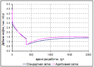 Рисунок 5 - Динамика среднесуточного дебита для двух вариантов разработки. В четвертом разделе проанализированы подходы к выбору технологии и методу воздействия на остаточные запасы путем ГТМ и МУН, осуществлено практическое внедрение разработанного комплексного подхода для адаптации разработки Харампурского и Фестивального месторождений. Сложность геологии объекта (наличие тектонических нарушений, разломно - блоковое строение, характерное для юрских отложений Пуровского района) является основным фактором, играющим первостепенную роль при выборе стратегии разработки и влияющим на ее эффективность в дальнейшем. Присутствие обширной сети разломов на месторождении приводит к необходимости введения "рамок", ограничивающих внедрение систем размещения проектных скважин. В частности, равномерные рядные системы с геометрически равномерным расположением сетки скважин в каждый выделенный сетью разломов блок залежи, обеспечивают различным количеством добывающих и нагнетательных скважин, что в свою очередь приводит к неравномерному их соотношению и невозможности поддержания проектного уровня компенсации в одном блоке, либо его превышению в другом блоке. Дисбаланс и последующая потеря первоначальной энергетики юрских пластов приводит в дальнейшем к трудно восполнимым потерям углеводородного сырья. В частности, на примере газовых сеноманских залежей Западно-Таркосалинского и Ямбургского месторождений установлена связь абсолютно свободного дебита с расстоянием до тектонической зоны. Доказано, что степень воздействия тектонической зоны на продуктивность скважин для сеноманских отложений поддается количественной оценке: приразломная часть характеризуется резким увеличением продуктивности в 2-4 раза, в сравнении со скважинами, находящимися на расстоянии более 2 км от разлома. В четвертом разделе выявлена степень влияния разломов осадочного чехла, связанных с оперяющими системами кулисных сбросов (взбросов) горизонтальных сдвигов фундамента, на эффективность работы скважин. Чем ближе забой скважины пласта Ю1 Харампурского месторождения расположен к разлому (1-1,5 км), тем выше фильтационно-емкостные характеристики (ФЕС) в данном районе и выше безводная добыча (от 72 до 40 тыс.т./скв). На расстоянии 1,7-2,2 км от разлома, безводная добыча скважин кратно ниже от 19,5 до 4,9 тыс.т./скв. Приразломная зона (1-1,5км) характеризуется повышенными ФЕС, более высокими значениями коэффициентов нефтенасыщенности, и, как следствие, лучшими параметрами эффективности эксплуатации скважин (безводная добыча нефти, средние и удельные дебиты нефти и жидкости). С расстояния 2,2 км и более - параметры работы скважин ухудшаются (рисунок 6). На основе выявленной зависимости получено итоговое уравнение, дающее возможность прогнозирования расчетной продуктивности проектных скважин, расположенных вблизи разломов сдвигового типа: Qбд(L)=11071e-3.6153 L , (1) где: Qбд – безводная добыча нефти на 1 скважину, тыс.т/скв. L – расстояние забоя скважины до тектонического нарушения сдвигового типа, км