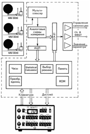 Одноканальный комплект фирмы Брюль и Къер (Дания) показан на рис. 9.3. Комплект датчиков типа ММ 0030 включает шаровой термометр 1 , сухой 2 и влажный 3 термометры. Влажный термометр имеет емкость, заполненную дистиллированной водой. Измерительный прибор, выполненный по компьютерной технологии, и выдает результат без вмешательства оператора. Трехканальная конфигурация этого прибора позволяет определить ТНС–индекс, включая взвешенный показатель. Для этого достаточно перед измерениями задать режим работы измерительного прибора. Блок схема 3–х канального комплекса приведена на рис. 9.5. Такая комплектация позволяет одновременно измерять значение WBGT –индекса в рассмотренных точках и рассчитывать взвешенный показатель