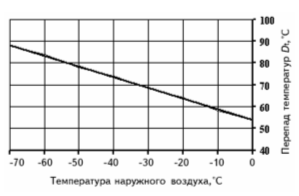 где y – перепад температур воздуха Dt в помещении относительно наружной, о С; x – температура наружного воздуха t н , о С; m – угол наклона функции к оси абсцисс, ; c – значение функции при наружной температуре 0о С.