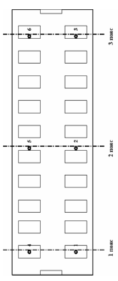 = В случае, если погрешность испытаний превышает приписанную методике испытаний 0,05 Вт/м2 ·К, испытания проводят повторно. Средний коэффициент теплопередачи ограждений помещения оценивают удовлетворительно, если он меньше или равен нормативному значению. В противном случае его оценивают неудовлетворительно. 10.2 Сертификация показателя "Эффективность системы подогрева помещений" При сертификации показателя эффективности подогрева помещения оценивают следующие параметры: · максимальный перепад температур в помещении относительно наружной при максимально отрицательной наружной температуре Dt max , заданной ТУ, о С; · время достижения заданной температуры воздуха в помещении при заданной ТУ наружной температуре t, мин; · точность поддержания температуры воздуха в помещении, ± Dt , 0 С. Время достижения заданной температуры определяют при включении системы отопления на максимальную мощность при испытаниях на стоянке. Эффективность системы отопления измеряют в диапазоне отрицательных наружных температур и заданной постоянной скорости движения объекта: · для локомотивов и МВПС с конструкционной скоростью; · для самоходного СПС с конструкционной скоростью и на стоянке; · для несамоходного СПС – на стоянке. В случае невозможности проведения испытаний при конструкционной скорости допускается проводить испытания при другой постоянной скорости с последующим расчетом на условия, заданные ТУ. Окна и двери в помещении должны быть закрыты, устройство подачи наружного воздуха должно работать с номинальной производительностью, а скорость ветра не должна превышать 7 м/с. В случае жидкостной системы отопления объекта температура охлаждающей жидкости двигателя должна поддерживаться на уровне, предусмотренном ТУ. Система отопления должна быть включена на максимальную производительность. При отрицательных наружных температурах, близких к 0о С, допускается проводить испытания на частичной мощности системы отопления. Полученный результат пересчитывают. Приняты следующие показатели оценки сертифицируемого параметра: · температура наружного воздуха в одной точке на уровне нижней кромки окна помещения, о С; · температура воздуха в помещении на уровне 1,5 м от пола, о С: ¾ в кабине – в одной точке в центре (рис. 10.1); ¾ в помещениях, площадью от 5 до 10 м2 – в 2-4 точках (рис. 10.1); ¾ в салоне вагона – в шести точках (рис. 10.2); · скорость ветра снаружи на уровне 1,5 м от земли на открытом пространстве, м/с; · скорость движения транспортного средства, км/ч; · время нагрева до заданной температуры, мин. Точность приборов должна быть не хуже:
